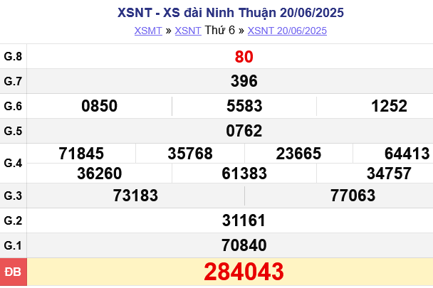 XSNT 20/6. Kết quả xổ số Ninh Thuận hôm nay ngày 20/6/2025 được quay thưởng vào lúc 17h15 bởi Công ty TNHH MTV Xổ số kiến thiết Ninh Thuận. Kết quả các giải thưởng XSNT 20/6/2025 sẽ được cập nhật liên tục từ giải nhất cho đến giải tám, cuối cùng là giải đặc biệt.