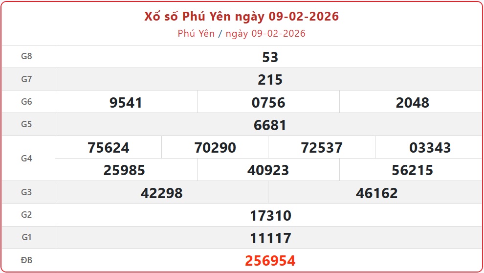 Kết quả xổ số Phú Yên ngày 9/2/2026