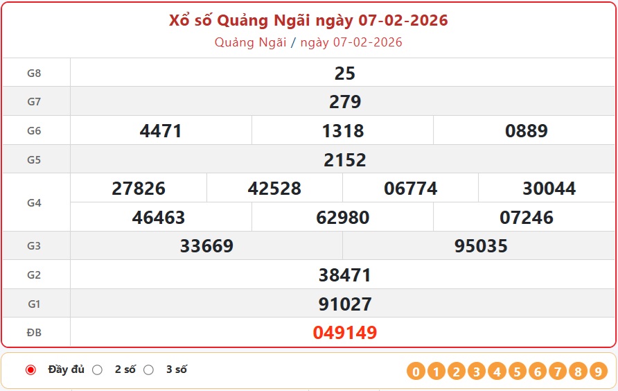 Kết quả xổ số Quảng Ngãi ngày 7/2/2026