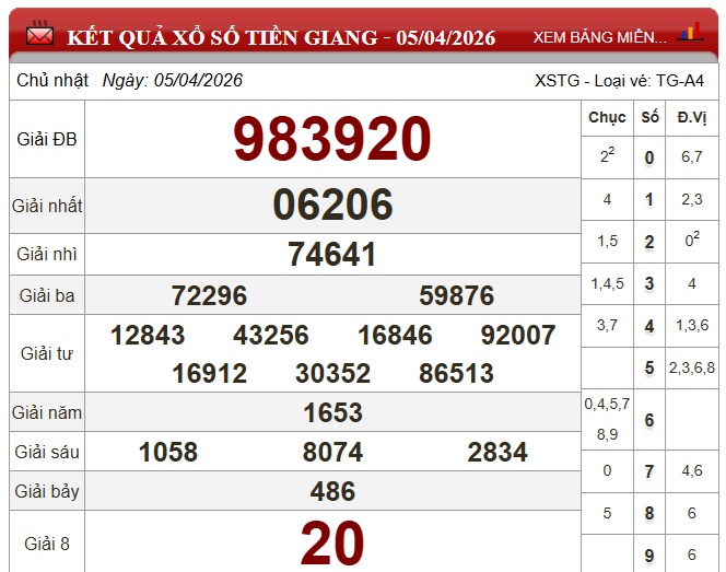 Kết quả xổ số Tiền Giang ngày 5/4/2026