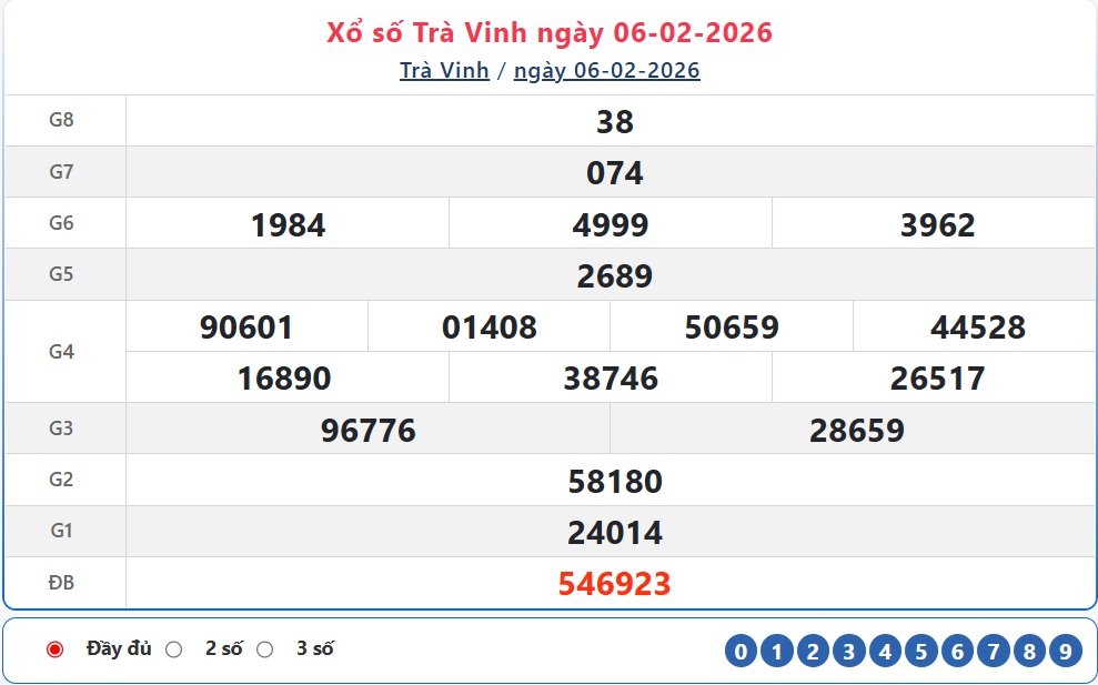 Kết quả Xổ số Trà Vinh ngày 6/2/2026