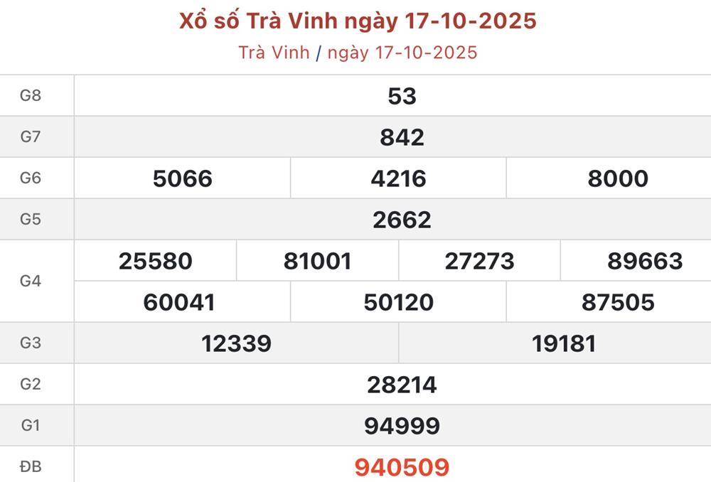 - XSTV 17/10, kết quả xổ số trà vinh ngày 17/10/2025