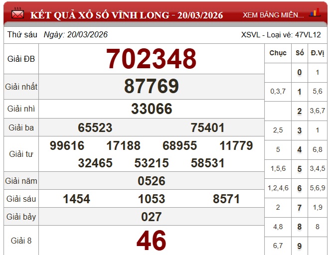 Kết quả xổ số Vĩnh Long Thứ Sáu ngày 20/3/2026