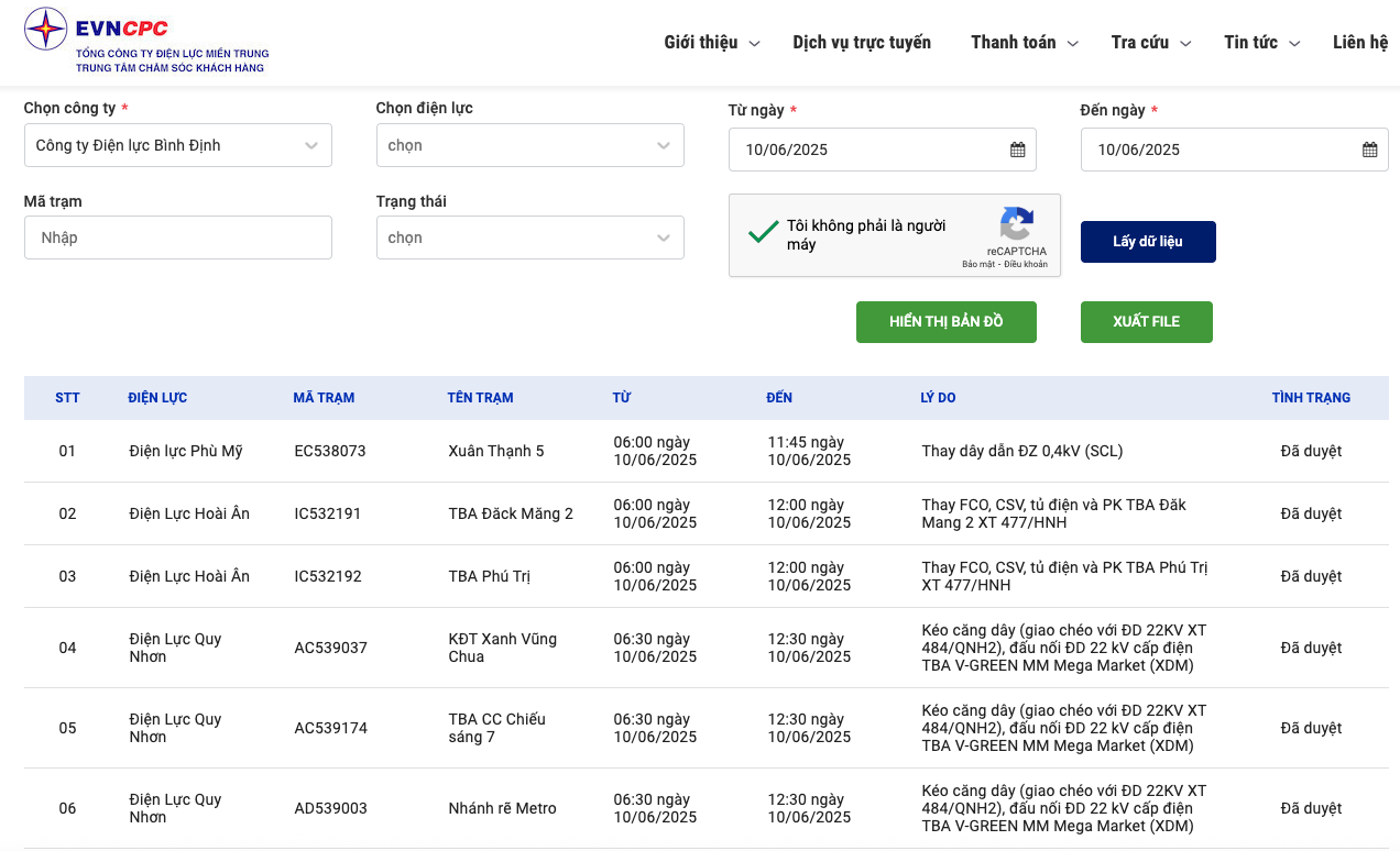 | Điện Lực Bồng Sơn | CC573227 | TBA Xuân Vinh 2 | 10/6/25 10:00 | 10/6/25 11:30 | Thay MBA | Đã duyệt |