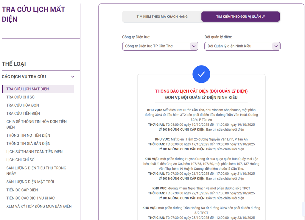 Lịch cắt điện tại Cần Thơ ngày 18/10/2025 được cập nhật tại website của Tổng công ty Điện lực miền Nam (EVNSPC).