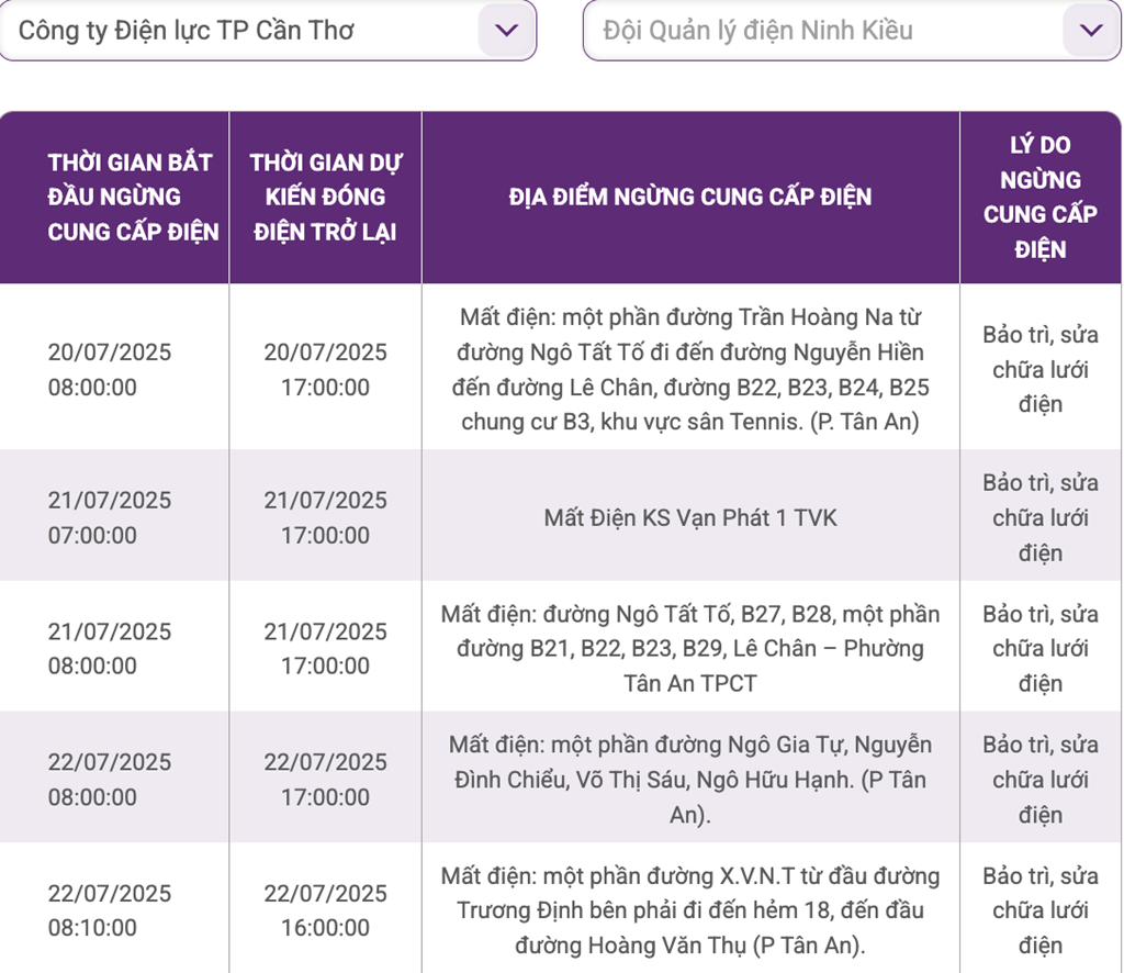 | 21/7/25 07:30 | 21/7/25 16:00 | Phường Vị Tân, TP Cần Thơ. | Bảo trì, sửa chữa lưới điện |