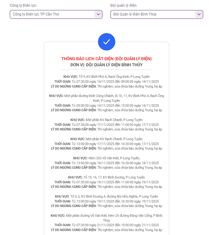 Công ty Điện lực thành phố Cần Thơ thông báo lịch cắt điện ngày 19/11/2025 tại các xã, phường trên địa bàn thành phố Cần Thơ trên website của Tổng Công ty Điện lực miền Nam như sau.