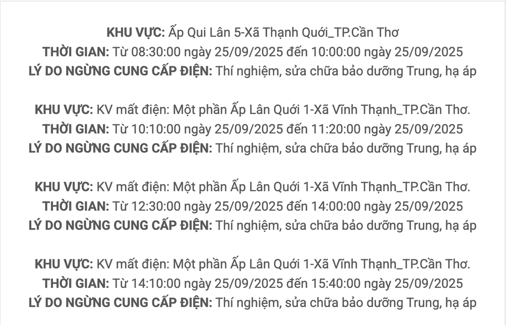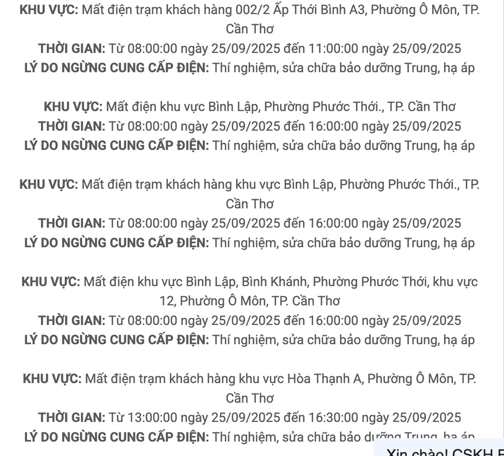 Lịch ngừng cấp điện trên địa bàn Cần Thơ ngày 25/9/2025 được cập nhật lúc 10h12 ngày 24/9 tại website của EVNSPC.