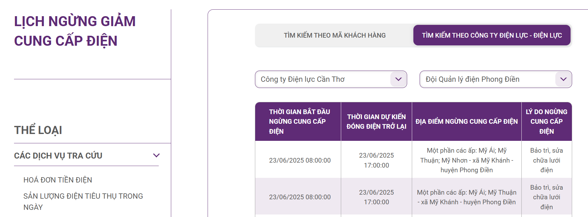 | 23/06/2025 08:00:00 | 23/06/2025 17:00:00 | Một phần các ấp: Mỹ Ái; Mỹ Thuận; Mỹ Nhơn - xã Mỹ Khánh - huyện Phong Điền | Bảo trì, sửa chữa lưới điện |