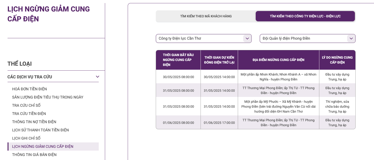 | 31/05/2025 08:00:00 | 31/05/2025 14:00:00 | TT Thương Mại Phong Điền; ấp Thị Tứ - TT Phong Điền - huyện Phong Điền | Đầu tư xây dựng Trung, hạ áp |