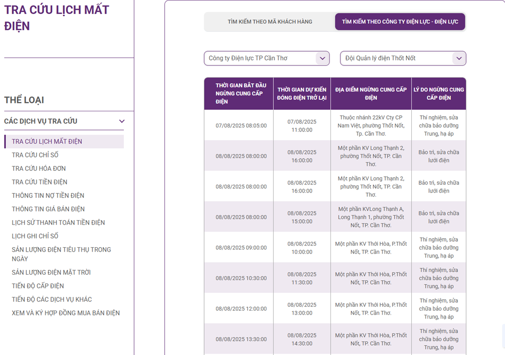 | 08/08/2025 08:00:00 | 08/08/2025 16:00:00 | Một phần KV Long Thạnh 2, phường Thốt Nốt, TP. Cần Thơ. | Bảo trì, sửa chữa lưới điện |