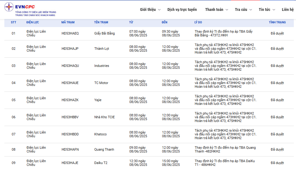 | 8 | Điện lực Liên Chiểu | HD53HAFN | Quang Thanh | 09:00 08/06/2025 | 12:00 08/06/2025 | Thay định kỳ TI đo đếm hạ áp TBA Quang Thanh -482HKH2 | Đã duyệt |