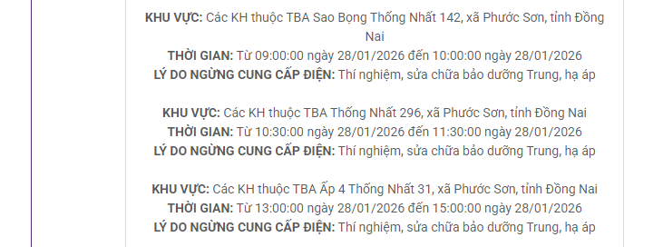 Thông tin về lịch cắt điện cập nhật mới nhất tại các xã, phường tỉnh Đồng Nai ngày 28/1/2026 cập nhật mới nhất.