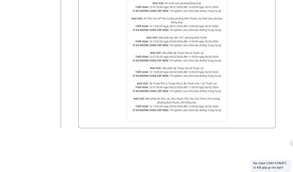 Cập nhật mới nhất lịch cắt điện cụ thể tại Đồng Nai từ website của Tổng công ty Điện lực miền Nam (EVNSPC), Công ty TNHH MTV Điện lực Đồng Nai vào ngày 30/1/2026.