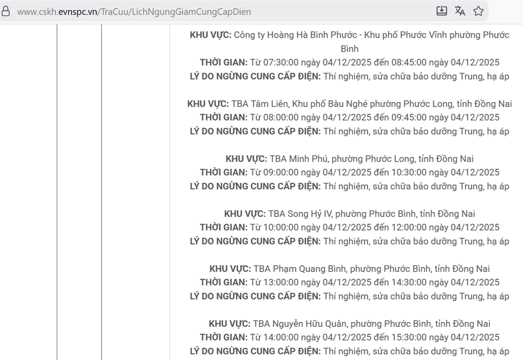 Lịch cắt điện (lịch tạm ngừng cấp điện mới nhất) cập nhật mới nhất tại Biên Hòa, lịch cắt điện tại Đồng Nai ngày 4/12/2025.