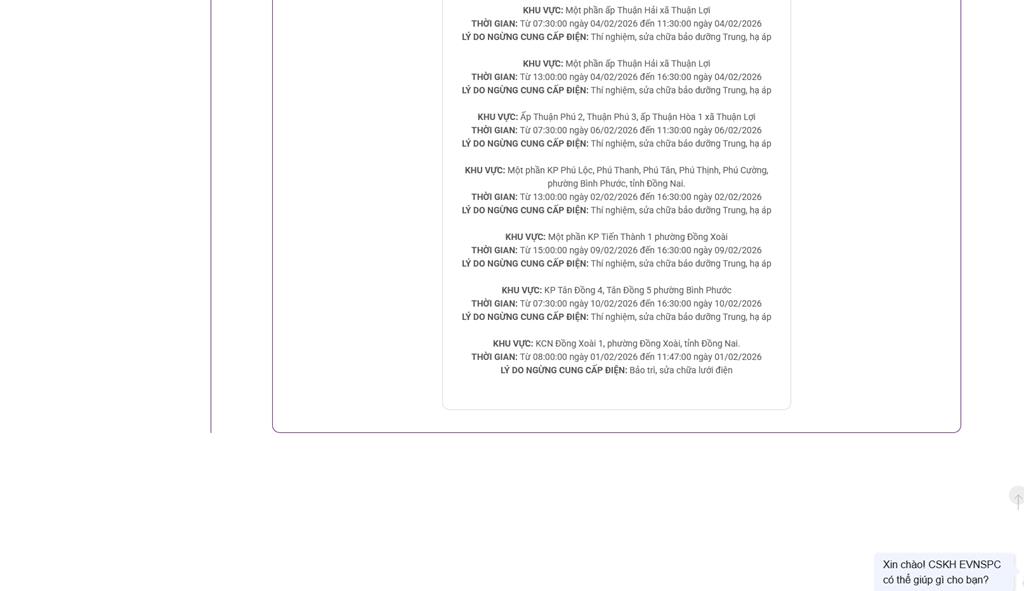 Thông tin về lịch cắt điện cập nhật mới nhất tại tỉnh Đồng Nai ngày 4/2/2026 cập nhật mới nhất.