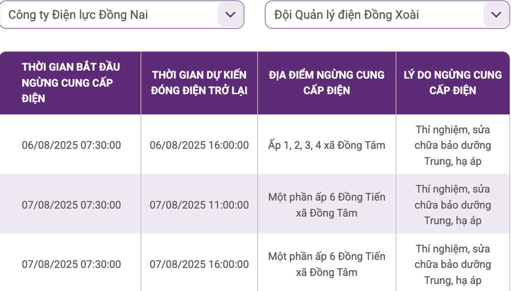 | 7/8/25 07:30 | 7/8/25 16:00 | Một phần ấp 6 Đồng Tiến xã Đồng Tâm | Thí nghiệm, sửa chữa bảo dưỡng Trung, hạ áp |