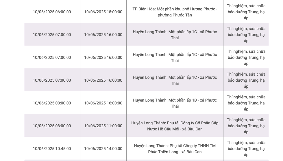 | 10/06/2025 7:00:00 | 10/06/2025 16:00:00 | Huyện Long Thành: Một phần ấp 1C - xã Phước Thái | Thí nghiệm, sửa chữa bảo dưỡng Trung, hạ áp |