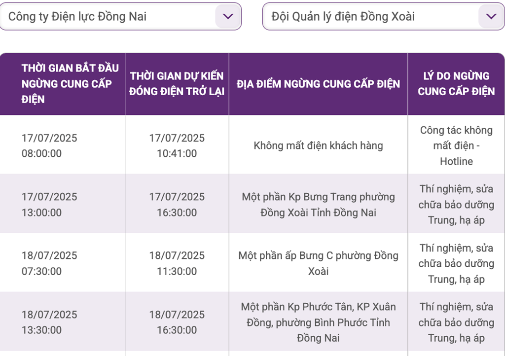 | 18/7/25 13:30 | 18/7/25 16:30 | Một phần Kp Phước Tân, KP Xuân Đồng, phường Bình Phước Tỉnh Đồng Nai | Thí nghiệm, sửa chữa bảo dưỡng Trung, hạ áp |