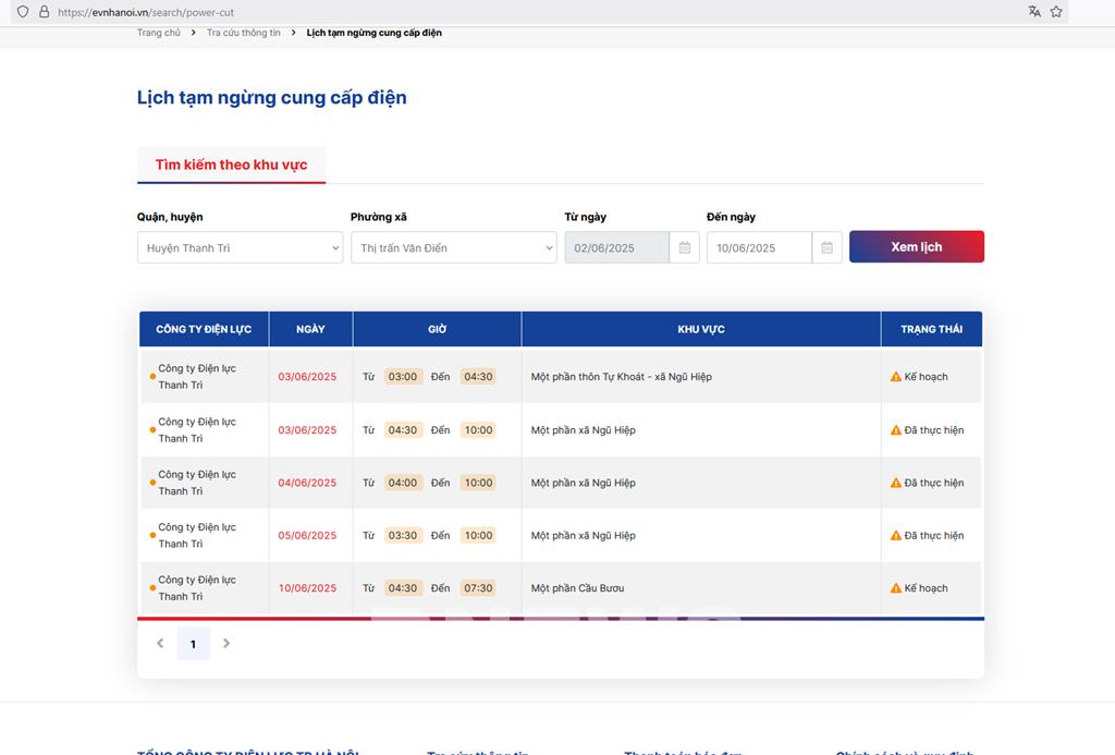 Tổng công ty Điện lực TP Hà Nội thông báo lịch cắt điện Hà Nội tại các quận, huyện ngày 10/6 tại https://evnhanoi.vn/search/power-cut.