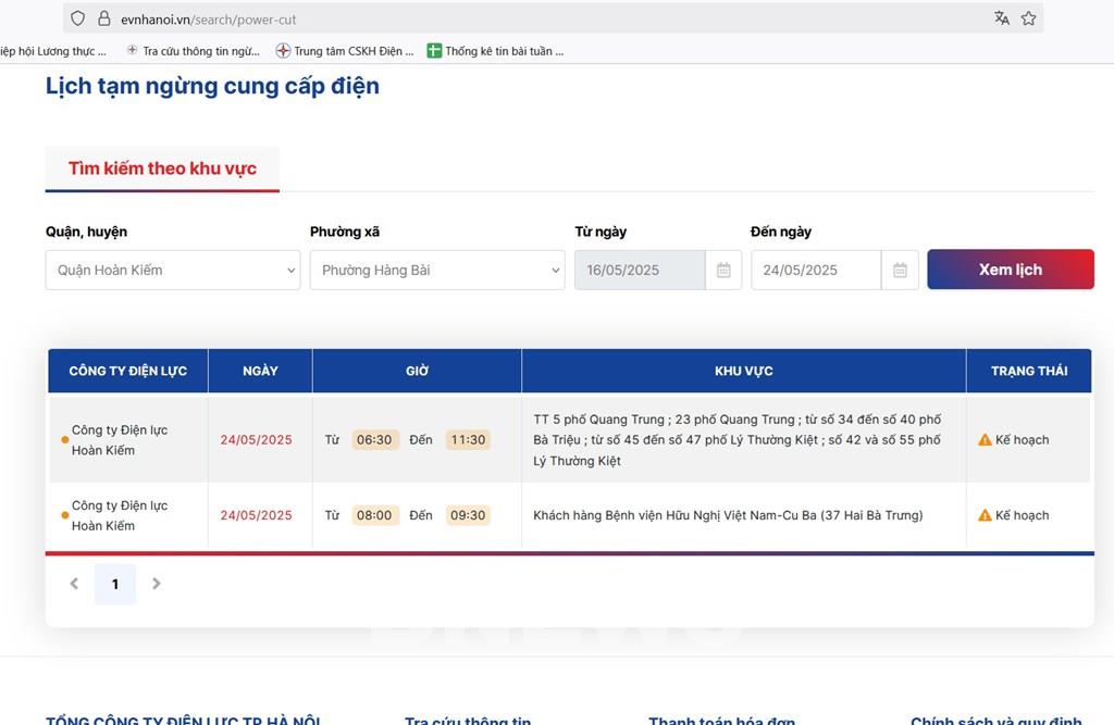 Tổng công ty Điện lực TP Hà Nội thông báo lịch cắt điện Hà Nội tại các quận, huyện ngày 24/5 tại https://evnhanoi.vn/search/power-cut.
