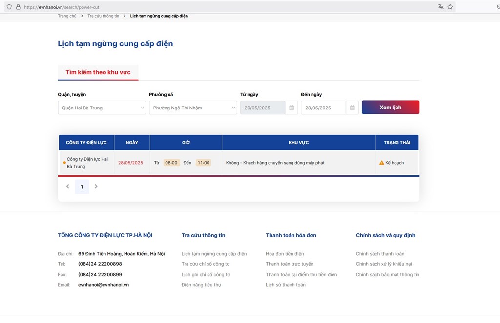 Tổng công ty Điện lực TP Hà Nội thông báo lịch cắt điện Hà Nội tại các quận, huyện ngày 28/5 tại https://evnhanoi.vn/search/power-cut.