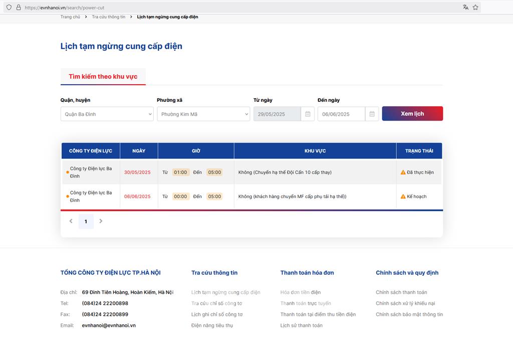 Tổng công ty Điện lực TP Hà Nội thông báo lịch cắt điện Hà Nội tại các quận, huyện ngày 6/6 tại https://evnhanoi.vn/search/power-cut.
