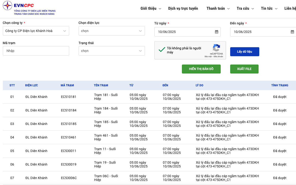 | ĐL Diên Khánh | ED530507 | Trạm 507 - CTCP Nước Giải Khát Yến Sào Khánh Hòa | 10/6/25 5:00 | 10/6/25 7:00 | Xử lý đấu lại đầu cáp ngầm tuyến 473DKH tại cột 473-475DKH_C1 | Đã duyệt |