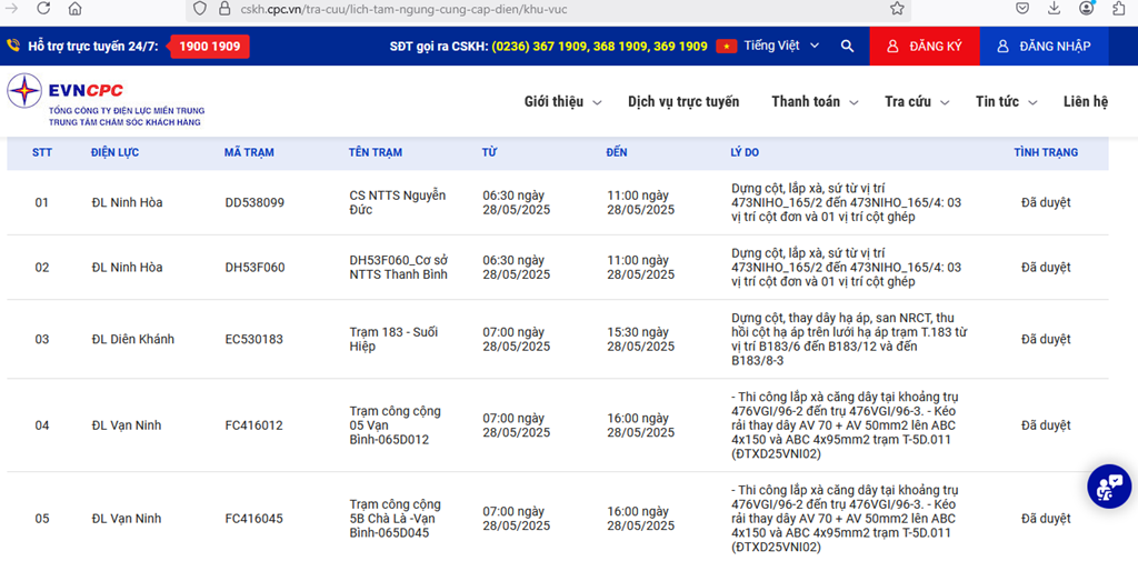| ĐL Cam Ranh | CD430357 | Cảng Cá Đá Bạc | 08:20 28/05/2025 | 09:20 28/05/2025 | Thay TI định kỳ trạm T357 | Đã duyệt |