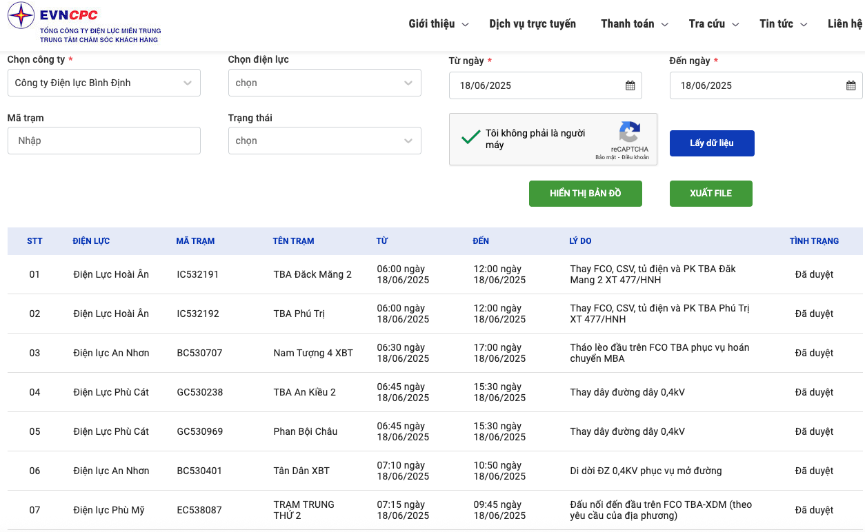 Lịch cắt điện Bình Định ngày mai 18/6 cập nhật ngày 17/6 tại website của EVNCPC.