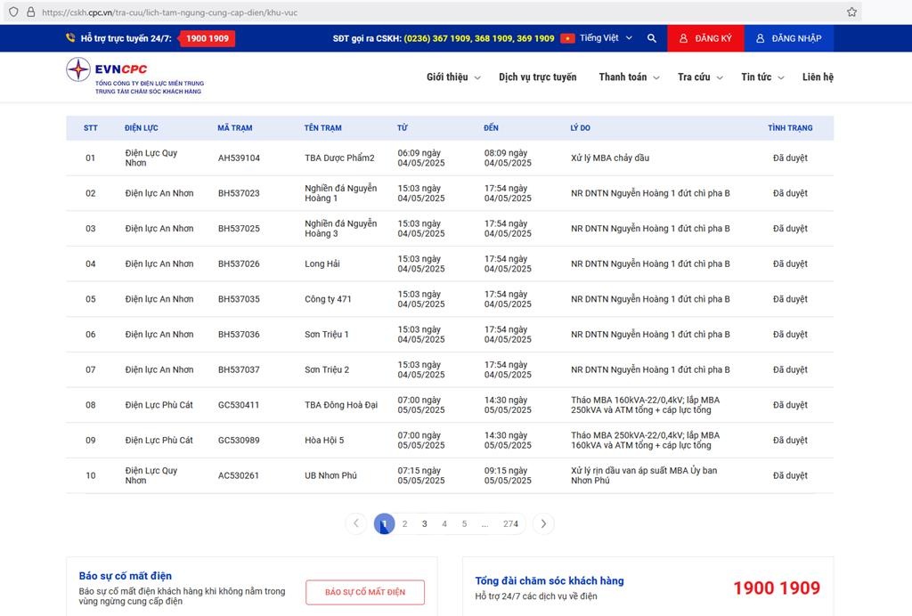 | 10 | Điện Lực Quy Nhơn | AC530261 | UB Nhơn Phú | 07:15 05/05/2025 | 09:15 05/05/2025 | Xử lý rịn dầu van áp suất MBA Ủy ban Nhơn Phú | Đã duyệt |