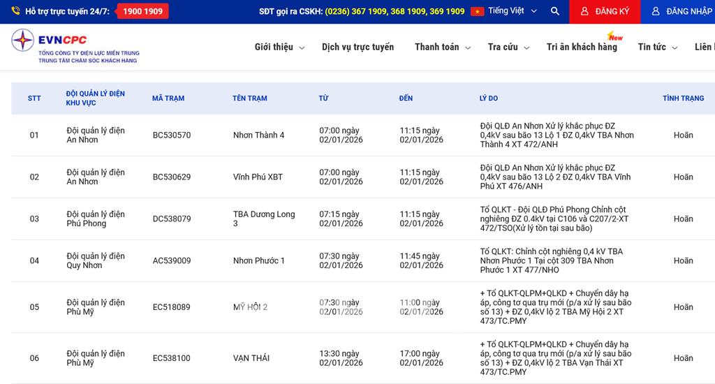 | 4 | Đội quản lý điện Quy Nhơn | AC539009 | Nhơn Phước 1 | 07:30 02/01/2026 | 11:45 02/01/2026 | Tổ QLKT: Chỉnh cột nghiêng 0,4 kV TBA Nhơn Phước 1 Tại cột 309 TBA Nhơn Phước 1 XT 477/NHO | Hoãn |