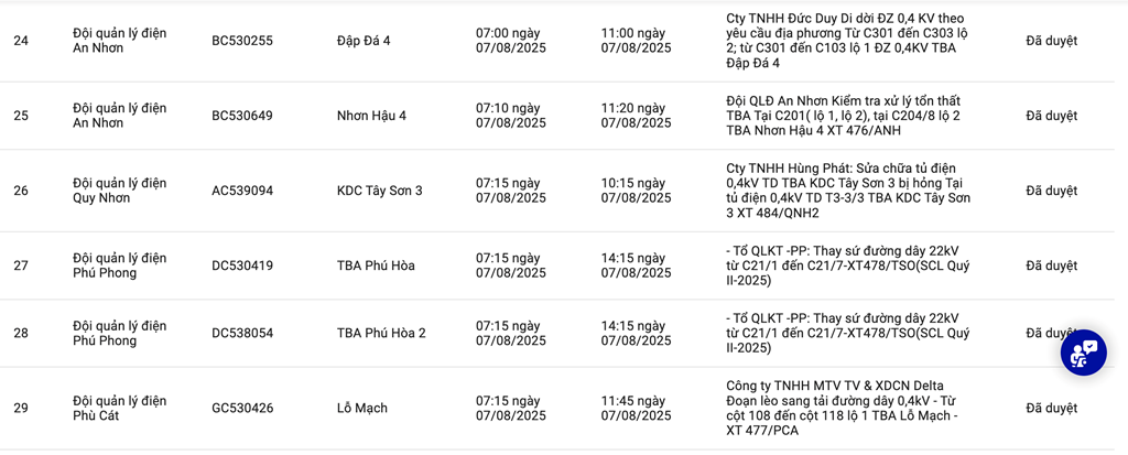 | 6 | Đội quản lý điện Quy Nhơn | AC539094 | KDC Tây Sơn 3 | 07:15 07/08/2025 | 10:15 07/08/2025 | Cty TNHH Hùng Phát: Sửa chữa tủ điện 0,4kV TD TBA KDC Tây Sơn 3 bị hỏng Tại tủ điện 0,4kV TD T3-3/3 TBA KDC Tây Sơn 3 XT 484/QNH2 | Đã duyệt |