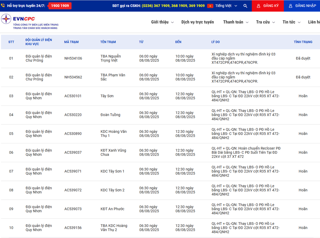 | 10 | Đội quản lý điện Quy Nhơn | AC539156 | TBA KDC Hoàng Văn Thụ 2 | 06:30 08/08/2025 | 12:30 08/08/2025 | QL-HT + QL-QN: Thay LBS- O PĐ Hồ Le bằng LBS- C Tại ĐD 22kV cột R35 XT 472- 484/QNH2 | Hoãn |