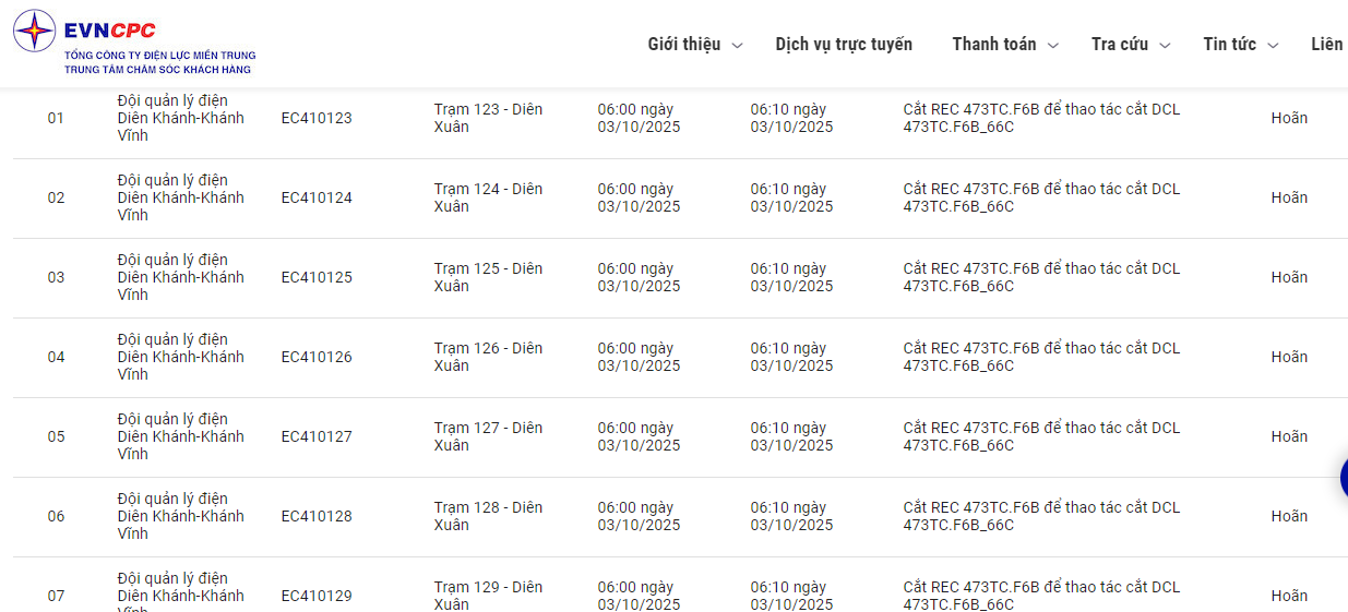 | Đội quản lý điện Diên Khánh-Khánh Vĩnh | EC410125 | Trạm 125 - Diên Xuân | 06:00 03/10/2025 | 06:10 03/10/2025 | Cắt REC 473TC.F6B để thao tác cắt DCL 473TC.F6B_66C | Hoãn |
