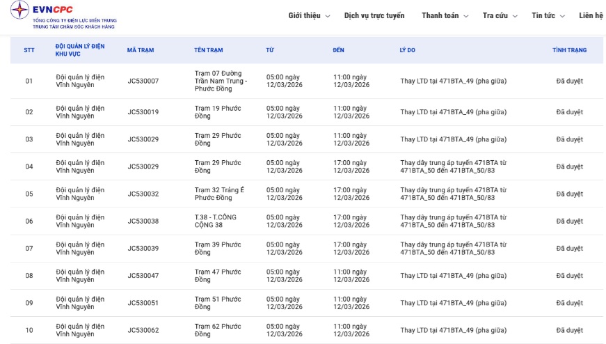 | Đội quản lý điện Vĩnh Nguyên | JC530039 | Trạm 39 Phước Đồng | 05:00 12/03/2026 | 17:00 12/03/2026 | Thay dây trung áp tuyến 471BTA từ 471BTA_50 đến 471BTA_50/83 | Đã duyệt |