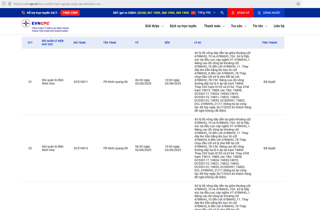 Lịch cắt điện Khánh Hòa ngày mai 2/8 trên website của EVNCPC cập nhật ngày 1/8.
