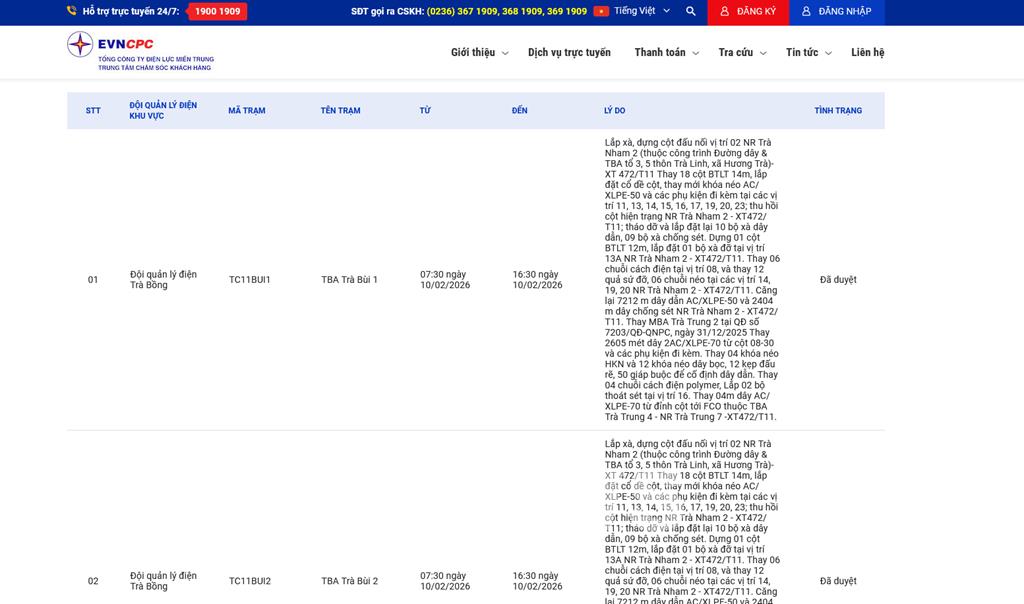 | 2 | Đội quản lý điện Trà Bồng | TC11BUI2 | TBA Trà Bùi 2 | 07:30 10/02/2026 | 16:30 10/02/2026 | Lắp xà, dựng cột đấu nối vị trí 02 NR Trà Nham 2 (thuộc công trình Đường dây & TBA tổ 3, 5 thôn Trà Linh, xã Hương Trà)- XT 472/T11
