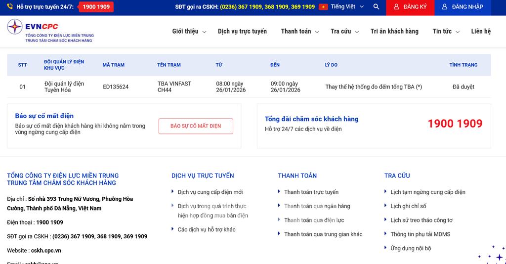 | 1 | Đội quản lý điện Tuyên Hóa | ED135624 | TBA VINFAST CH44 | 08:00 26/01/2026 | 09:00 26/01/2026 | Thay thế hệ thống đo đếm tổng TBA (*) | Đã duyệt |