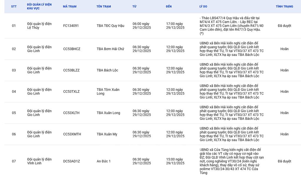 | 3 | Đội quản lý điện Gio Linh | CC53BLZZ | TBA Bách Lộc | 06:30 29/12/2025 | 12:00 29/12/2025 | UBND xã Bến Hải kiến nghị cắt điện để phát quang tuyến; Đội QLĐ Gio Linh kết hợp thay thế TU, TI tại VT83/37 XT 473 TC Gio Linh; XLTX hạ áp sau TBA Bách Lộc | Hoãn |