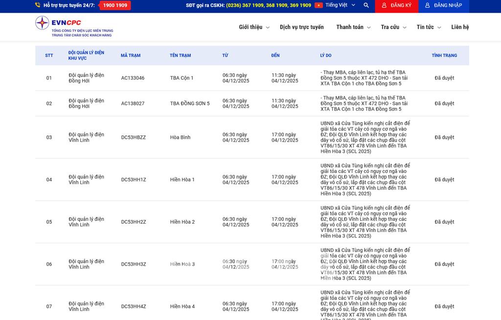 | 7 | Đội quản lý điện Vĩnh Linh | DC53HH4Z | Hiền Hòa 4 | 06:30 04/12/2025 | 17:00 04/12/2025 | UBND xã Cửa Tùng kiến nghị cắt điện để giải tỏa các VT cây có nguy cơ ngã vào ĐZ; Đội QLĐ Vĩnh Linh kết hợp thay các dây vô cổ sứ, lắp đặt các chụp đầu cột VT86/15/30 XT 478 Vĩnh Linh đến TBA Hiền Hòa 3 (SCL 2025) | Đã duyệt |