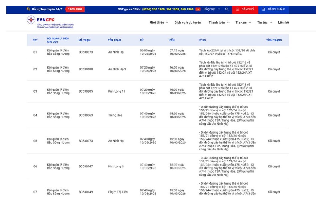 | 7 | Đội quản lý điện Bắc Sông Hương | BC530149 | Phạm Thị Liên | 07:40 10/03/2026 | 15:30 10/03/2026 | - Di dời đường dây trung thế vị trí cột 152/21 đến vị trí cột 152/24 và cột 152/24A thuộc xuất tuyến 475 Huế 2;