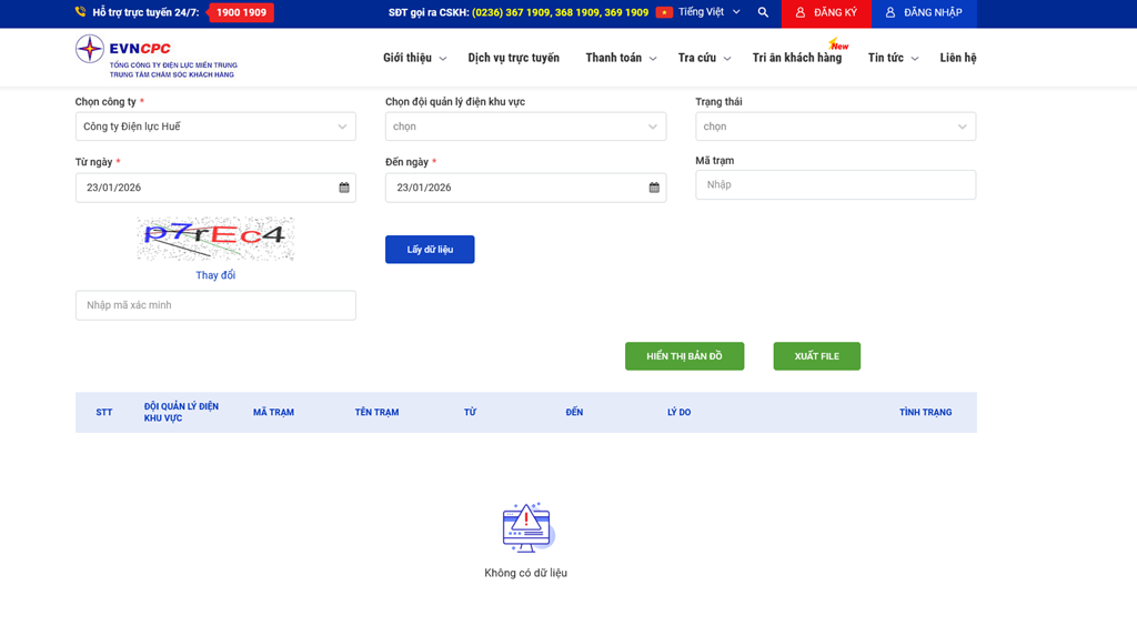 Lịch cắt điện thành phố Huế ngày 23/1/2026 trên website của EVNCPC cập nhật mới nhất.