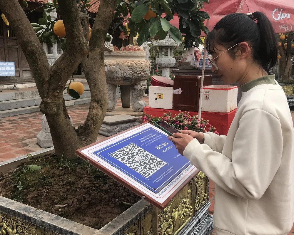 Dễ thấy sự hiện diện của mã QR ở nhiều nơi. Trong ảnh: Du khách sử dụng mã QR tra cứu thông tin tại đền Bia (Cẩm Giàng, Hải Dương). Ảnh: Tiến Vĩnh – TTXVN