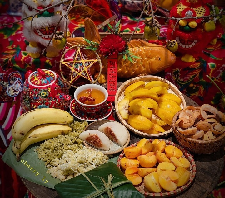 Bước tiếp là sắp xếp bánh kẹo và các vật phẩm khác. Sau khi hoàn thành mâm ngũ quả, bánh trung thu sẽ được đặt xung quanh. Các loại kẹo, cốm có thể cho vào những chiếc đĩa nhỏ xinh để xen kẽ, tạo sự phong phú. Một số gia đình còn khéo léo tỉa tót hoa quả thành hình thỏ ngọc, cá chép để tăng tính sáng tạo.