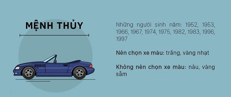 Nhìn chung, theo quy luật ngũ hành, người mệnh Thủy nên ưu tiên chọn màu trắng, xám, hoặc bạc để tối ưu hóa mệnh tương sinh. Ngoài ra, việc lựa chọn màu xe đỏ, tím, và hồng cũng có thể giúp giảm bớt các yếu tố chế khắc và mang lại may mắn cho cuộc sống và tuyệt đối không nên chọn các xe màu nâu, vàng sẫm vì các màu này thuộc mệnh Thổ mà mệnh Thuỷ kỵ Thổ.