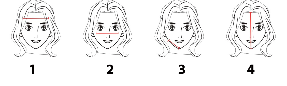Để chọn được kiểu tóc phù hợp, bạn cần xác định đúng dáng mặt. Cách xác định dáng mặt tương đối đơn giản. Dùng thước dây để đo lại khoảng cách ở một số điểm chính như trán, má, xương hàm và chiều dài tổng thể khuôn mặt (theo hình minh họa).