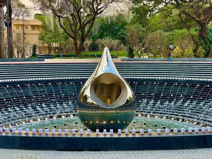 Đài tưởng niệm nạn nhân COVID-19 với biểu tưởng giọt nước ở trung tâm công viên.