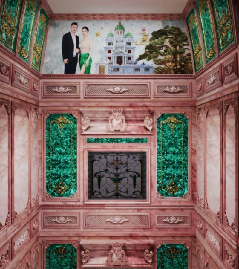 Thay vì sử dụng gỗ, cô quyết định ốp đá toàn bộ bên trong căn nhà. Những mảng tường được trang trí bằng loại đá khổng tước đắt tiền, với đội ngũ thi công từ Trung Quốc được mời về để lắp đặt.