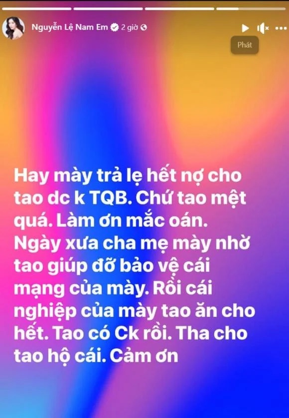 Vừa qua, Nam Em gây chú ý khi đăng đàn cực gắt đòi nợ một tài khoản. Cụ thể, Nam Em chia sẻ: "Hay mày trả lẹ hết nợ cho tao được không. Chứ tao mệt quá. Làm ơn mắc oán. Ngày xưa ba mẹ mày nhờ tao giúp đỡ bảo vệ cái mạng của mày. Rồi cái nghiệp của mày tao ăn cho hết. Tao có chồng rồi, tha cho tao hộ cái. Cảm ơn". Bên cạnh đó, cô còn bức xúc khi thần tượng của mình bị "dìm": "Hời ơi tao tức ghê. Thần tượng của tao bị bệnh mà còn quay up lên làm cái gì không biết. Rồi chúng nó toxic. Người thấu hiểu thì ít mà người cay độc thì nhiều".
